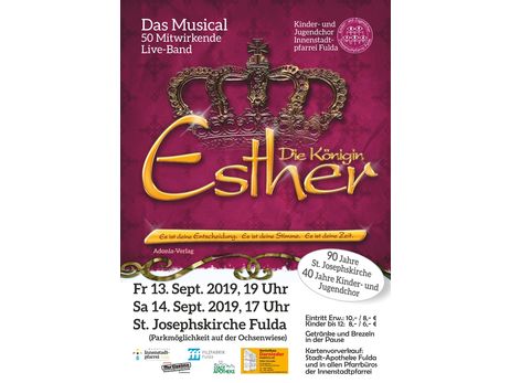 Der Kinder- und Jugendchor der Stadtpfarrei Fulda hat unter der Leitung von Johannes Haubs in zwei ausverkauften Vorstellungen mit großem Erfolg das Musical Esther auf die Bühne der Josephskirche gebracht. Der Chor feierte damit zugleich sein 40-jähriges Bestehen als auch den 90. Geburtstag der Kirche St. Joseph.